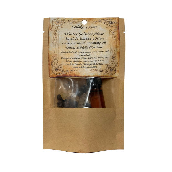 Use the anointing oil to anoint the altar, candles, your body, and any symbols of the season used in your ritual. Burn the loose incense during your Winter Solstice ritual. Use the loose incense and anointing oil to cleanse your home during the Winter season, and to bring the energy of Winter into your life. Made on the day of the Winter Solstice.